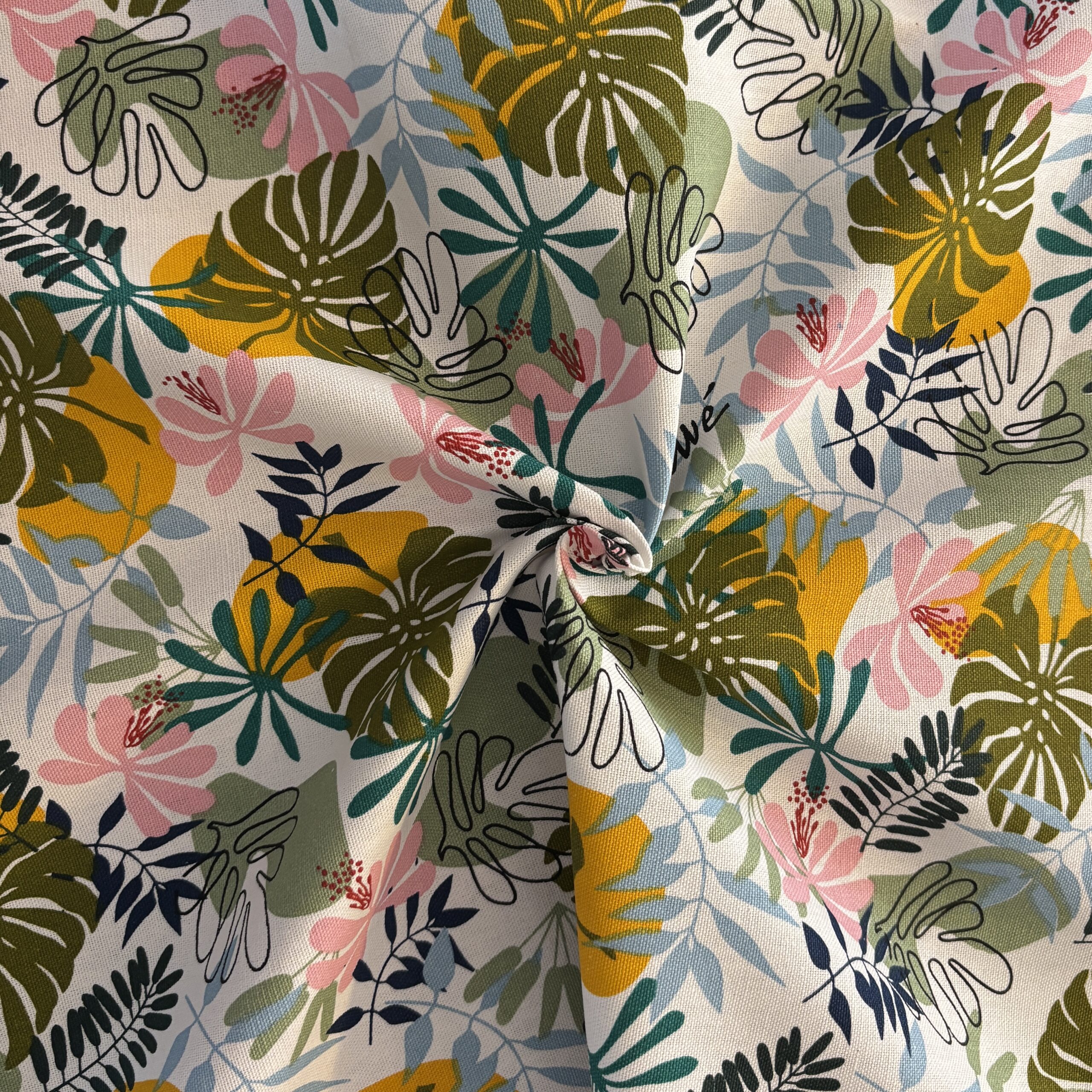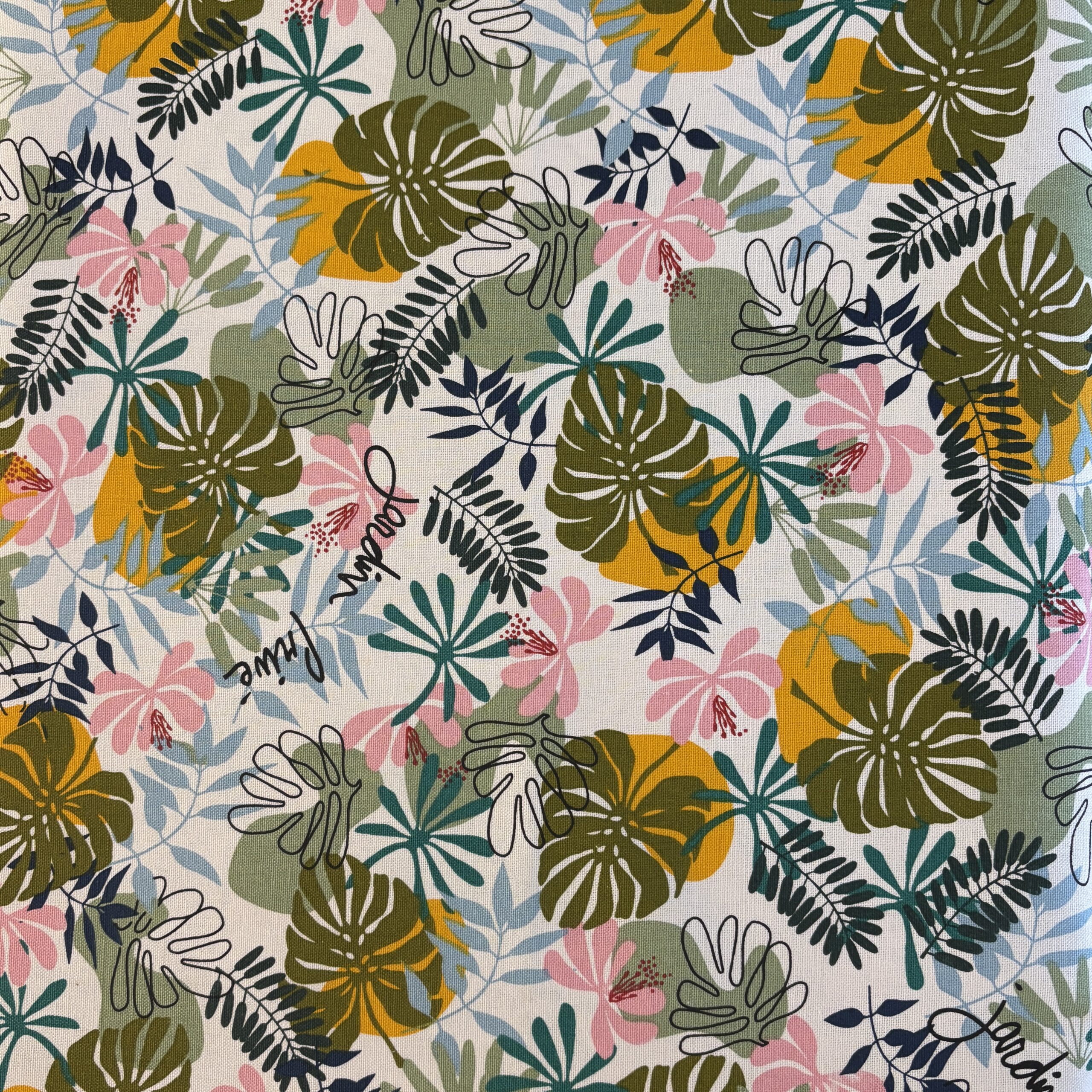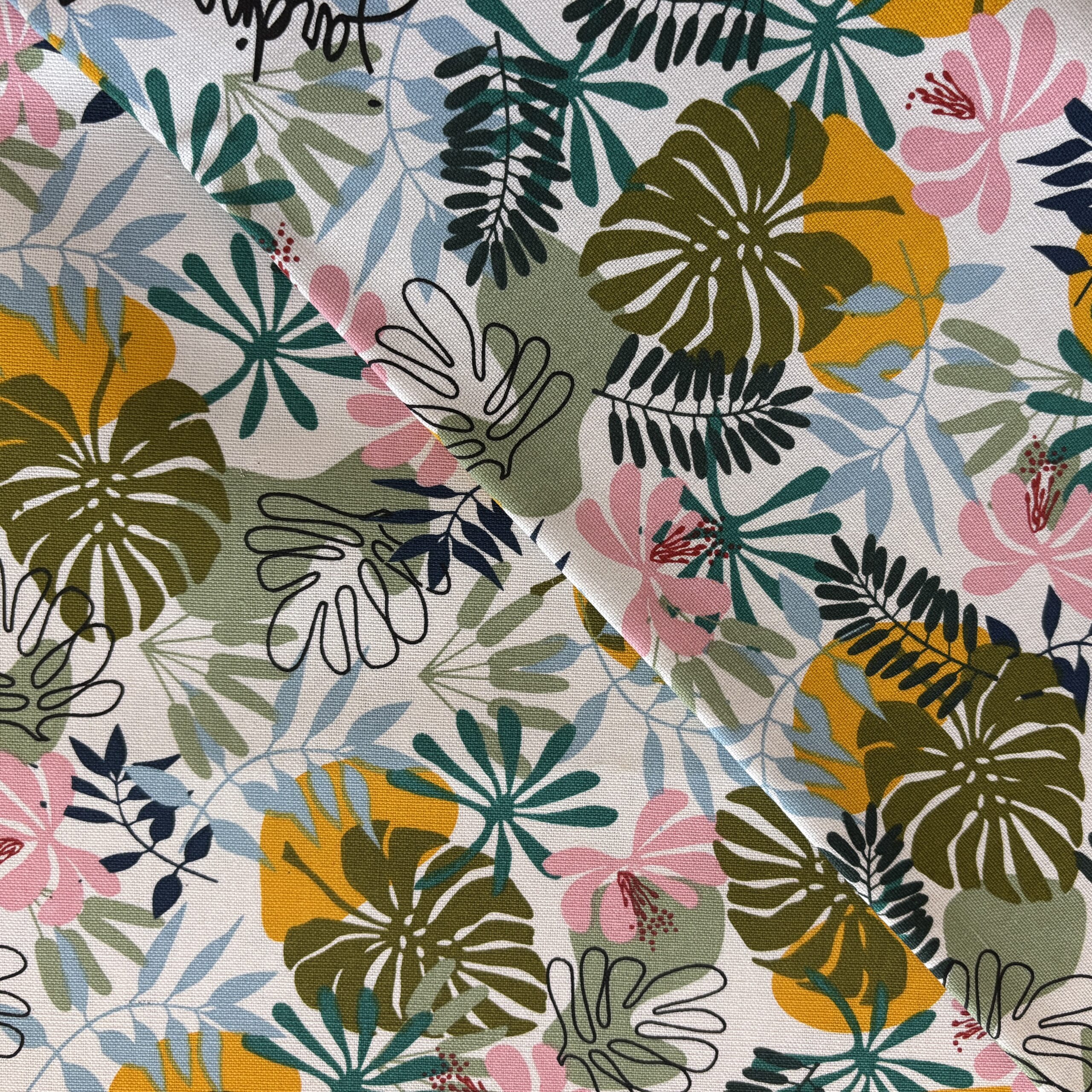 - Couleurs/Motifs : Motifs feuillage tropical coloré sur fond blanc