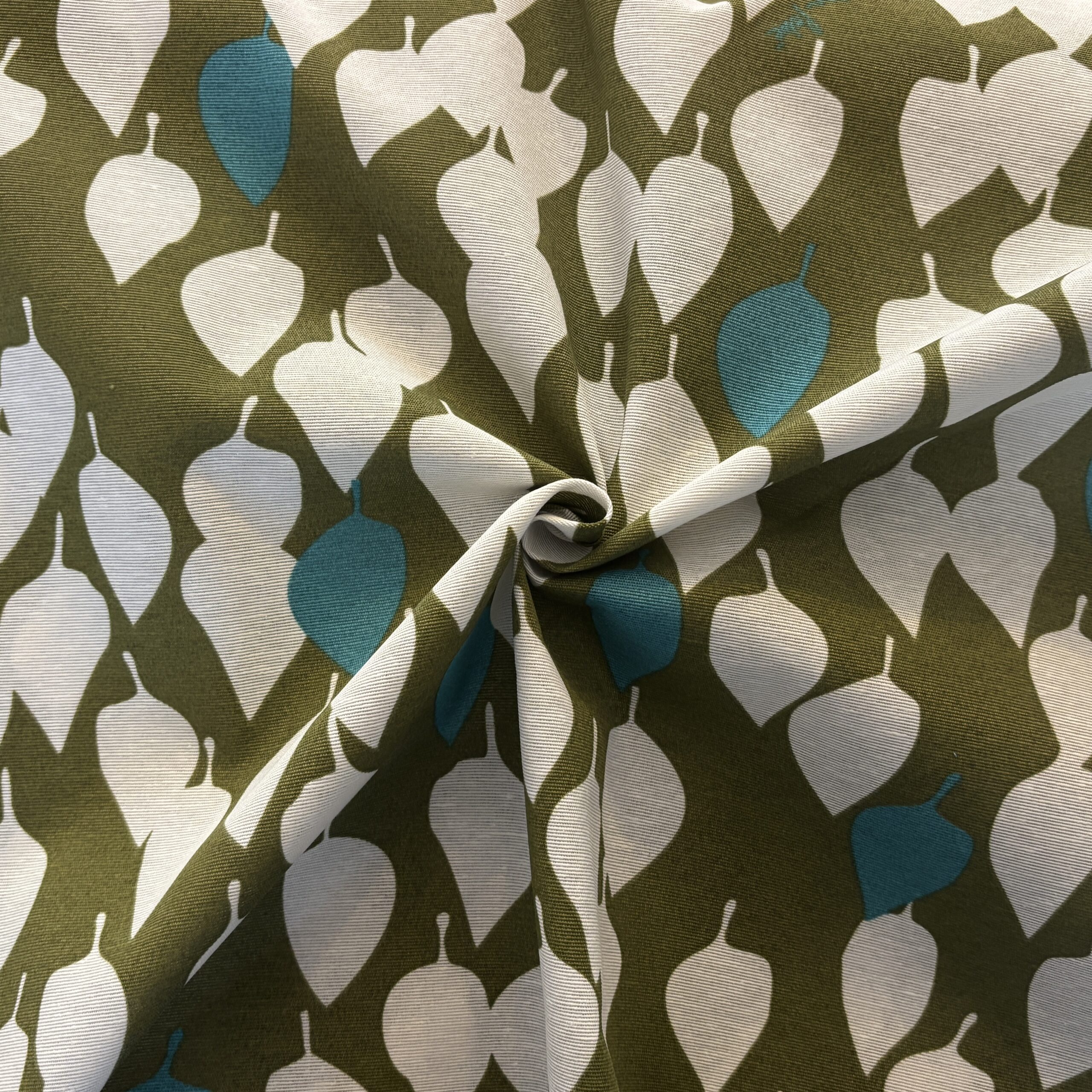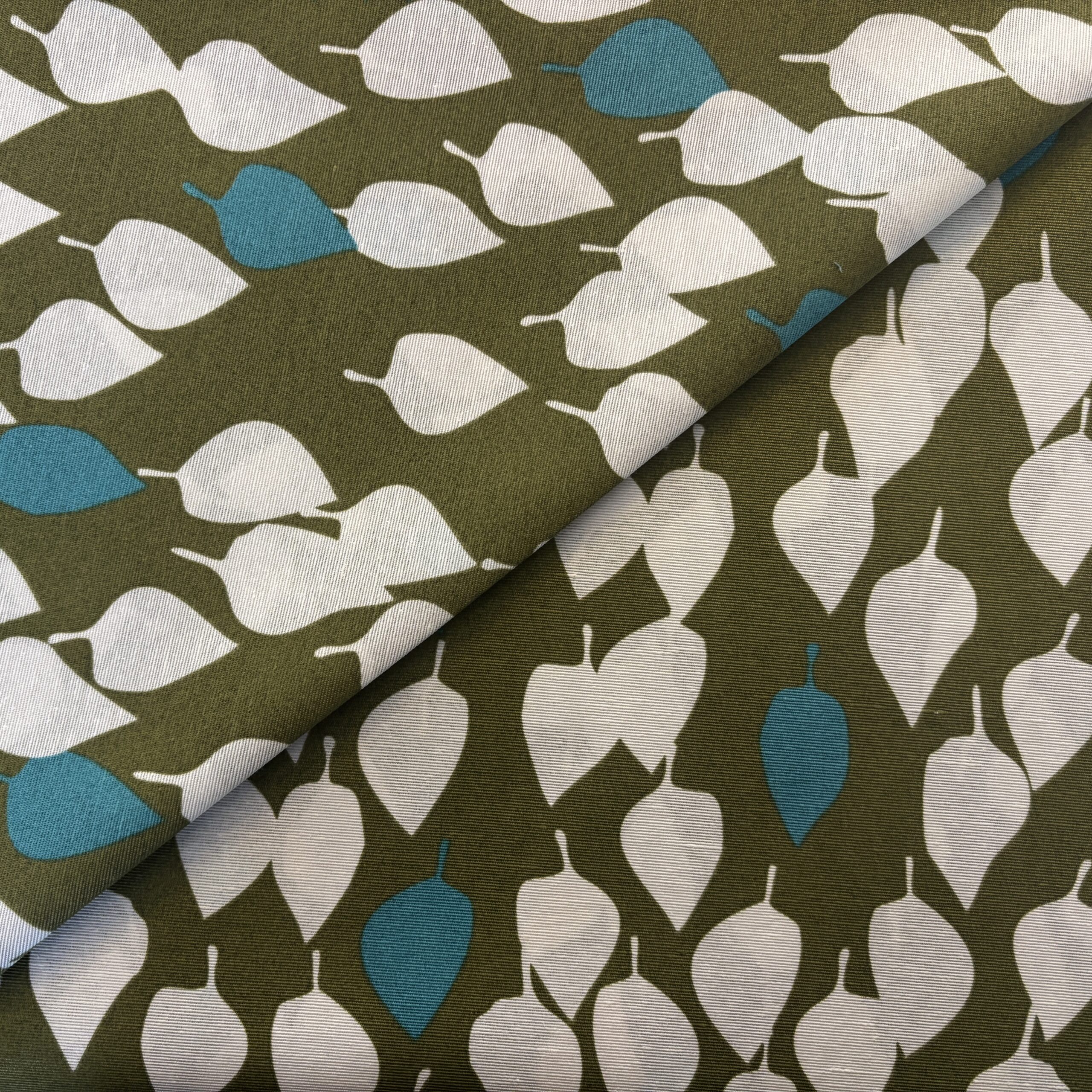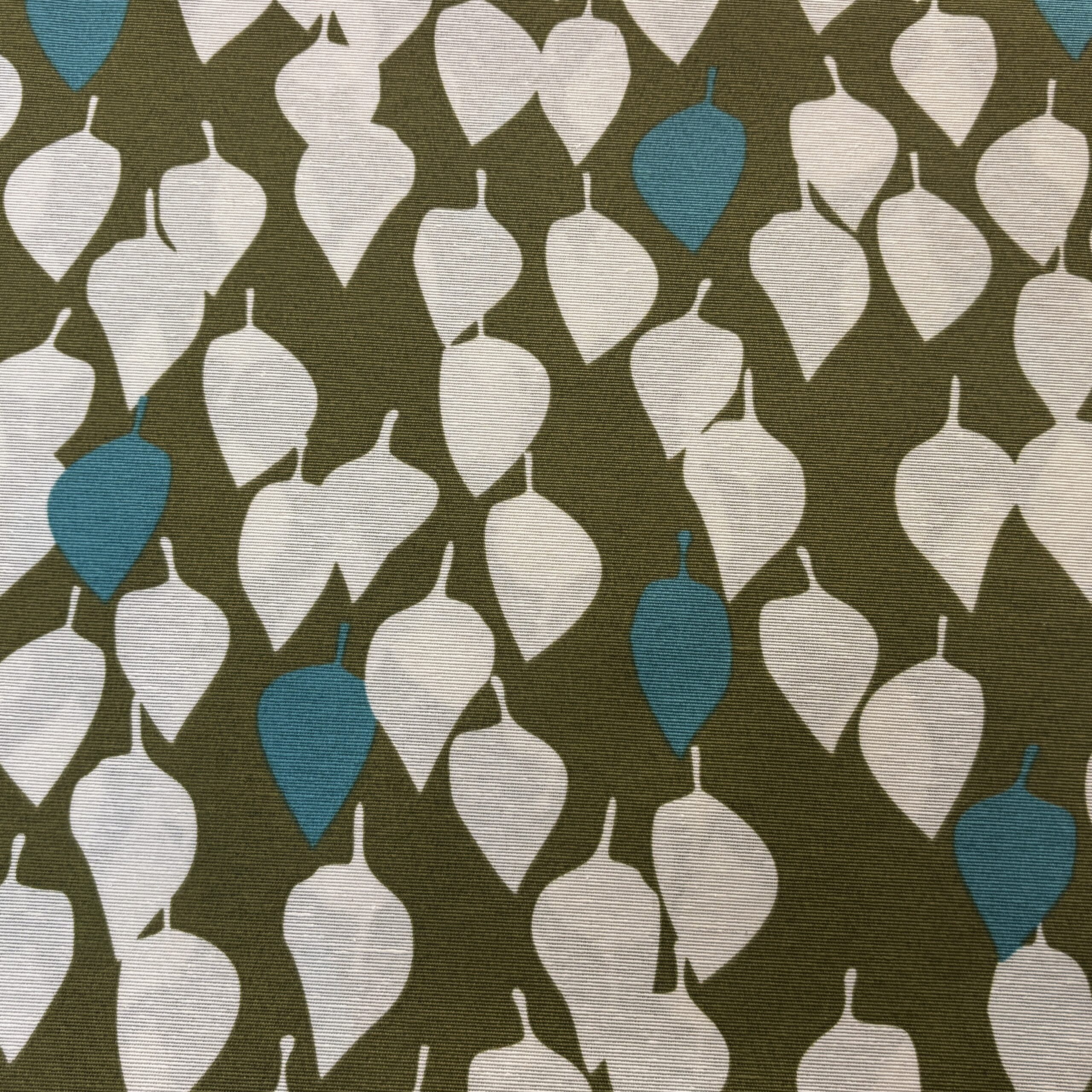 - Couleurs/Motifs : Motifs feuilles blanches et turquoise sur fond kaki