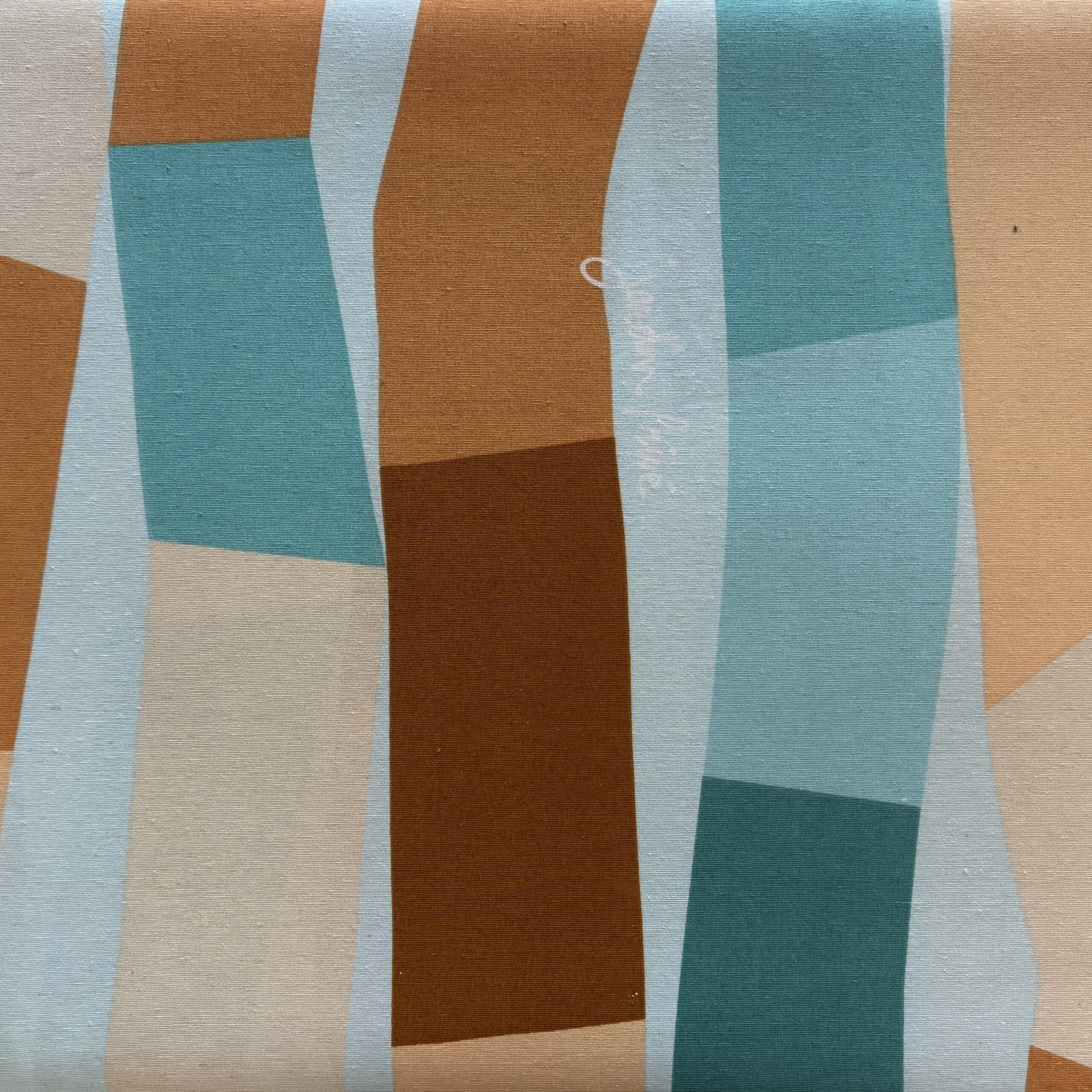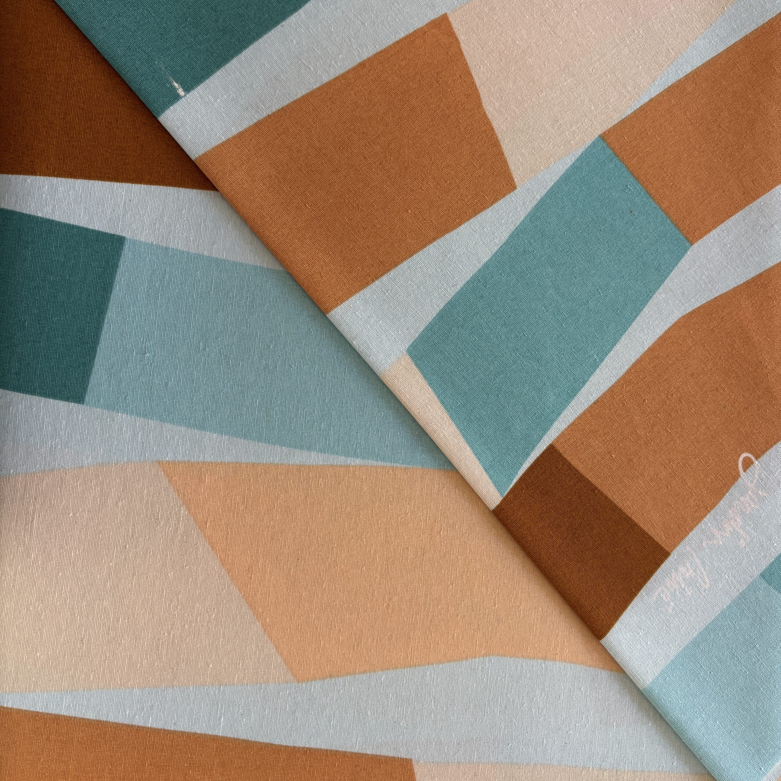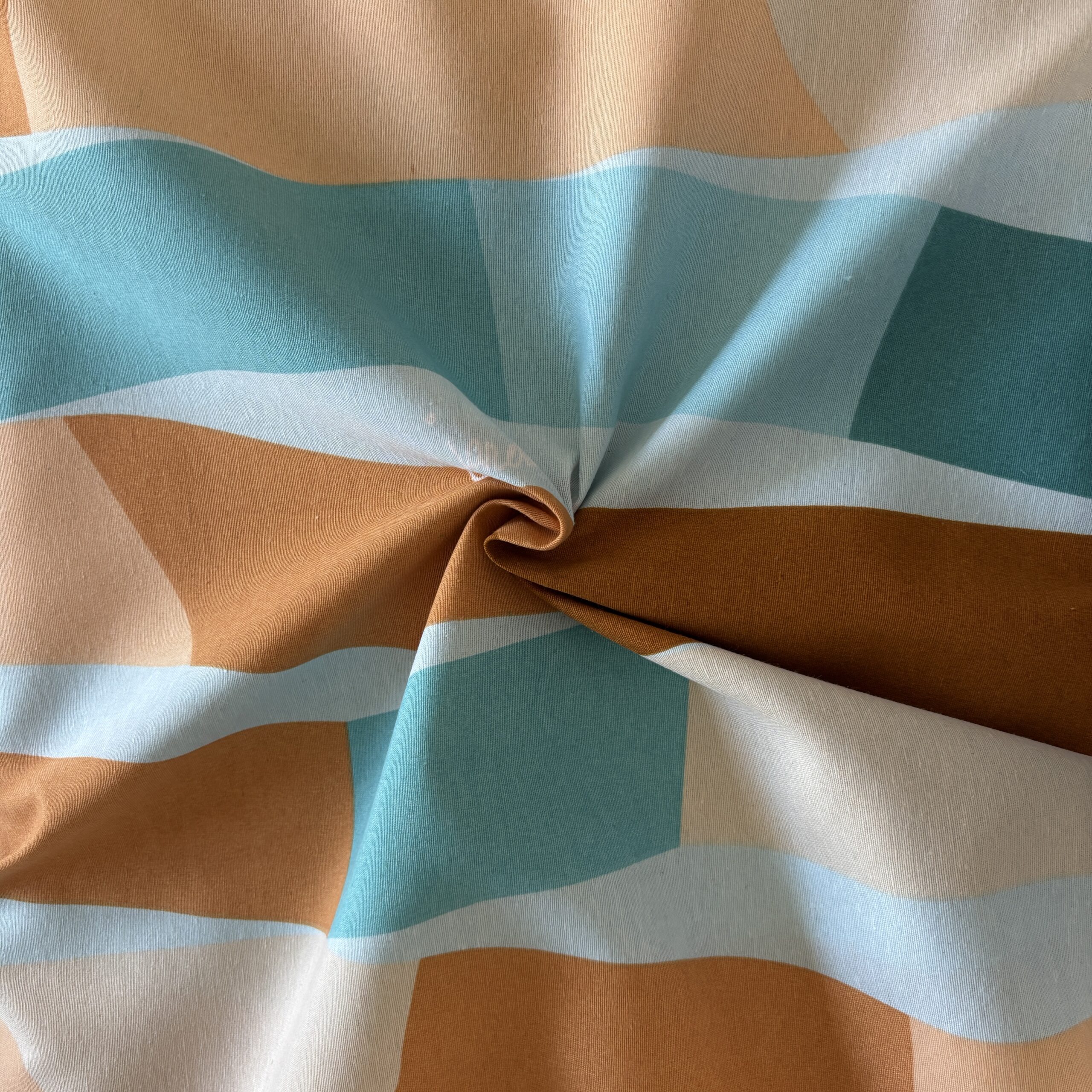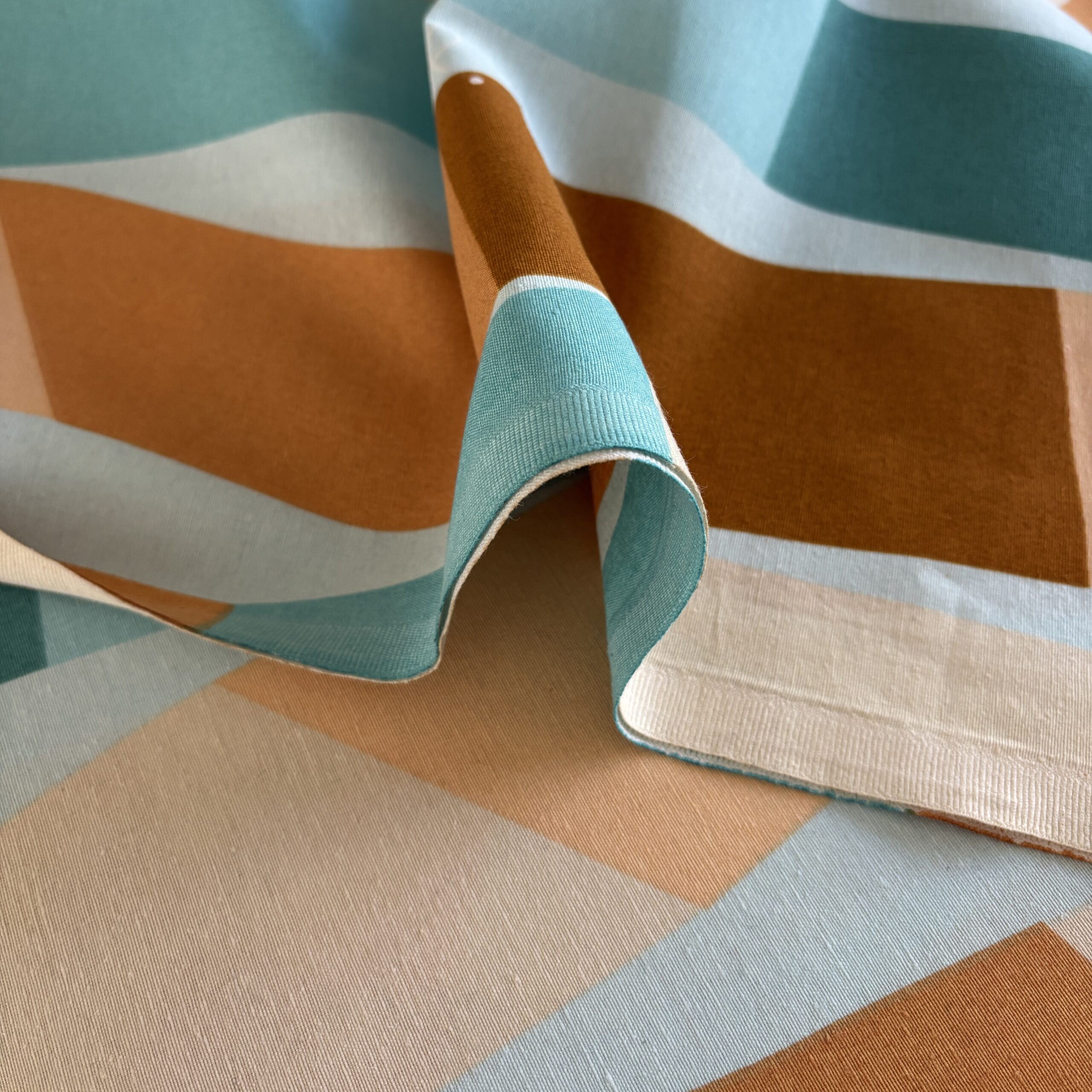 - Couleurs/Motifs : Motifs grosses rayures asymétriques turquoise, beige/ocre sur fond bleu ciel