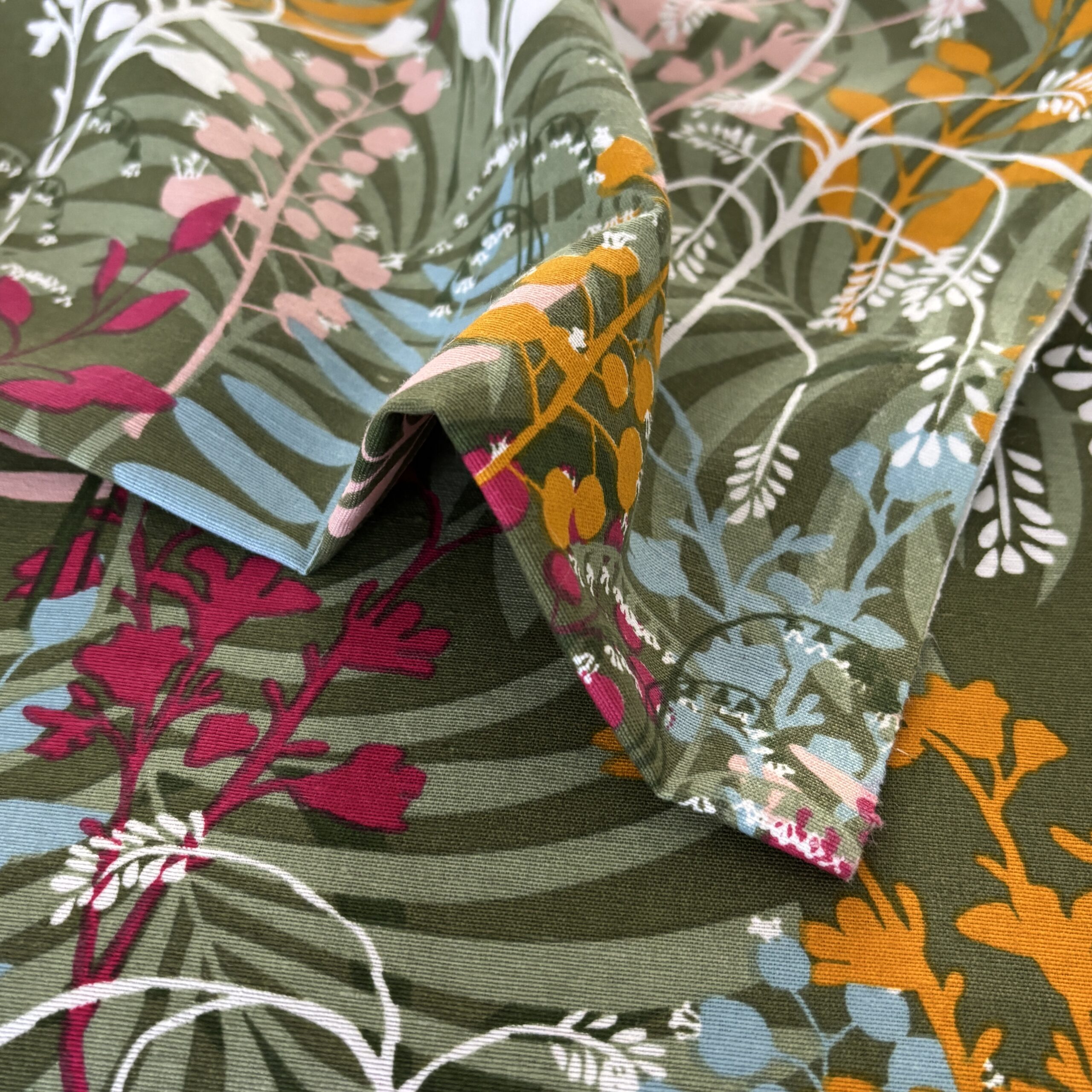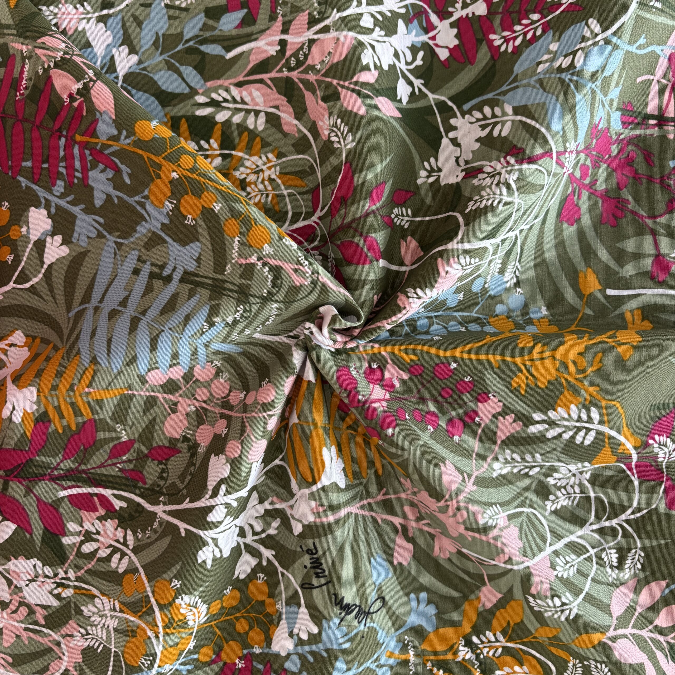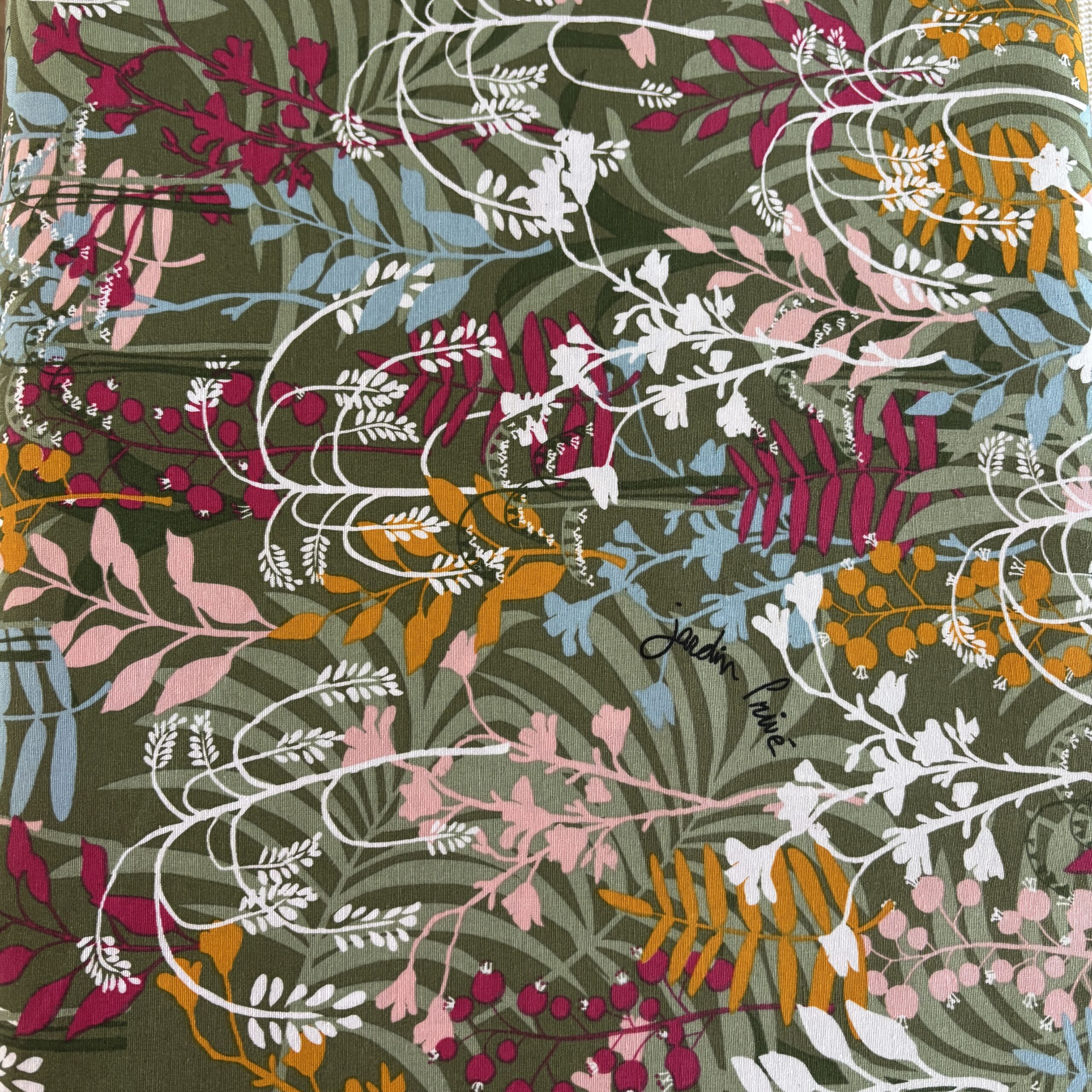 Coupon Polycoton Kaki végétaux colorés 1,40x3m