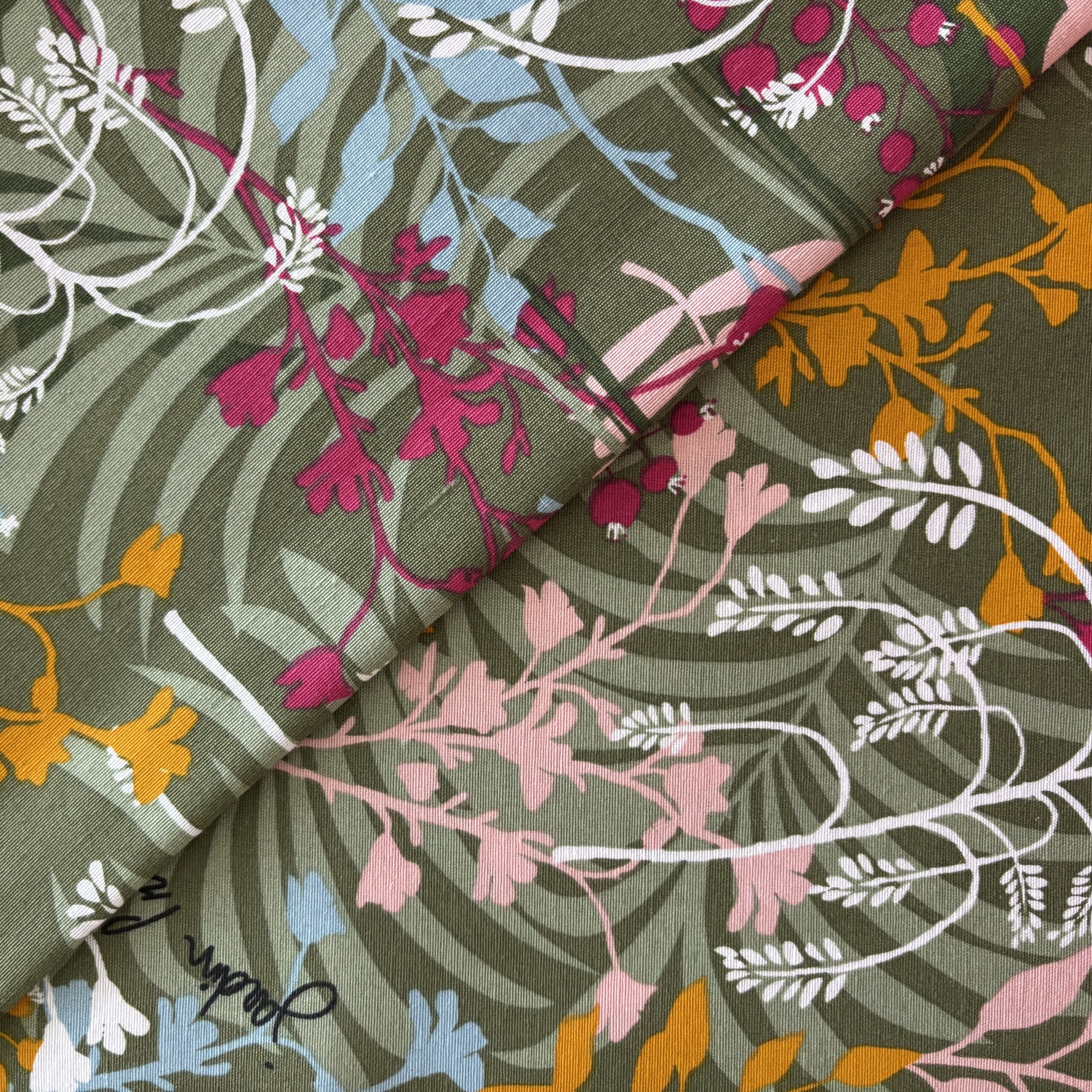 • Couleurs/Motifs : Motifs végétaux colorés sur fond kaki