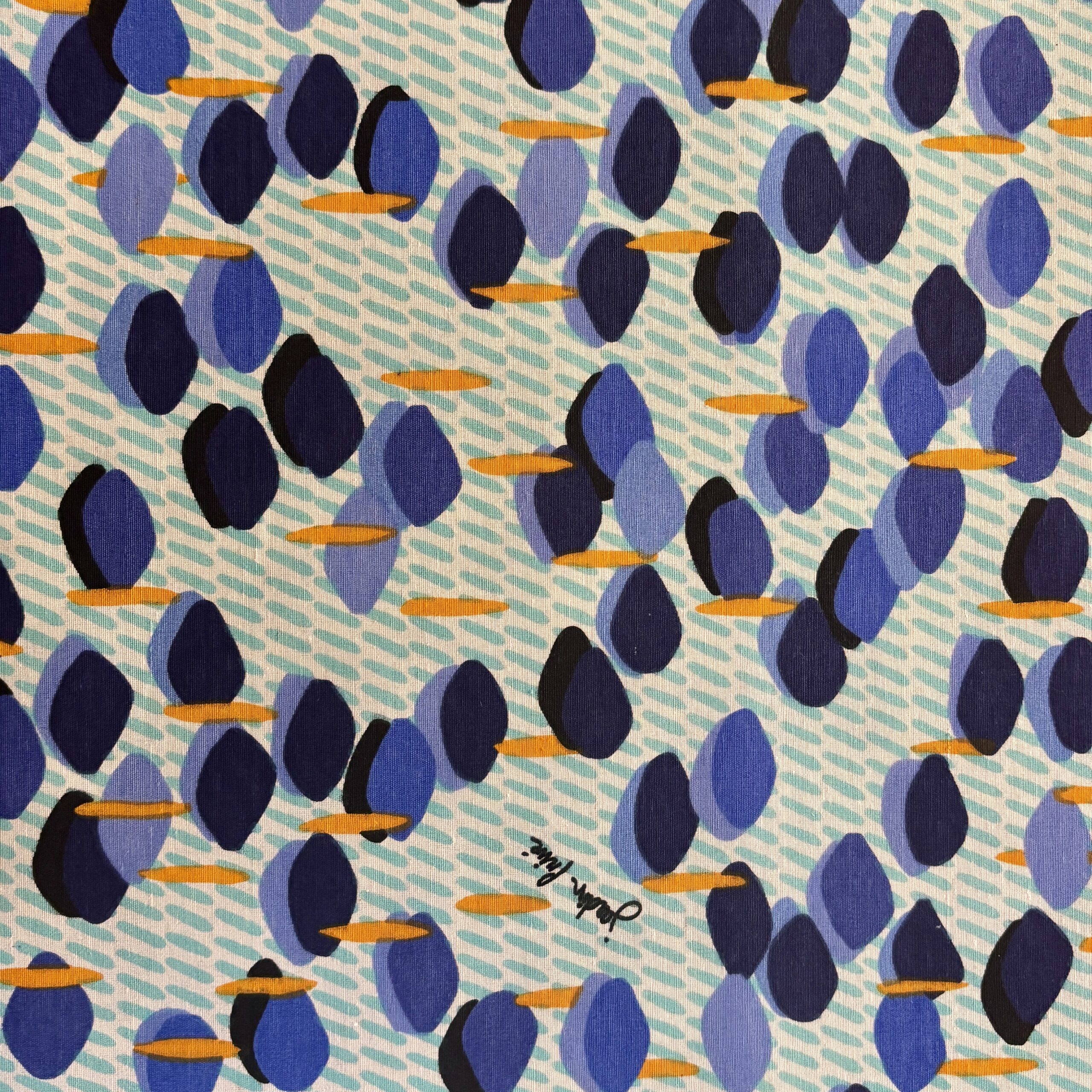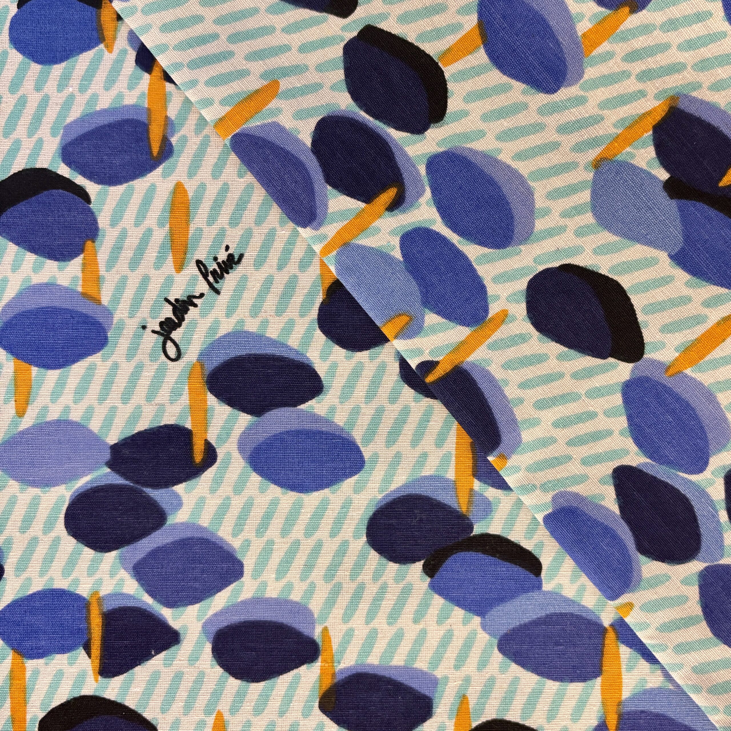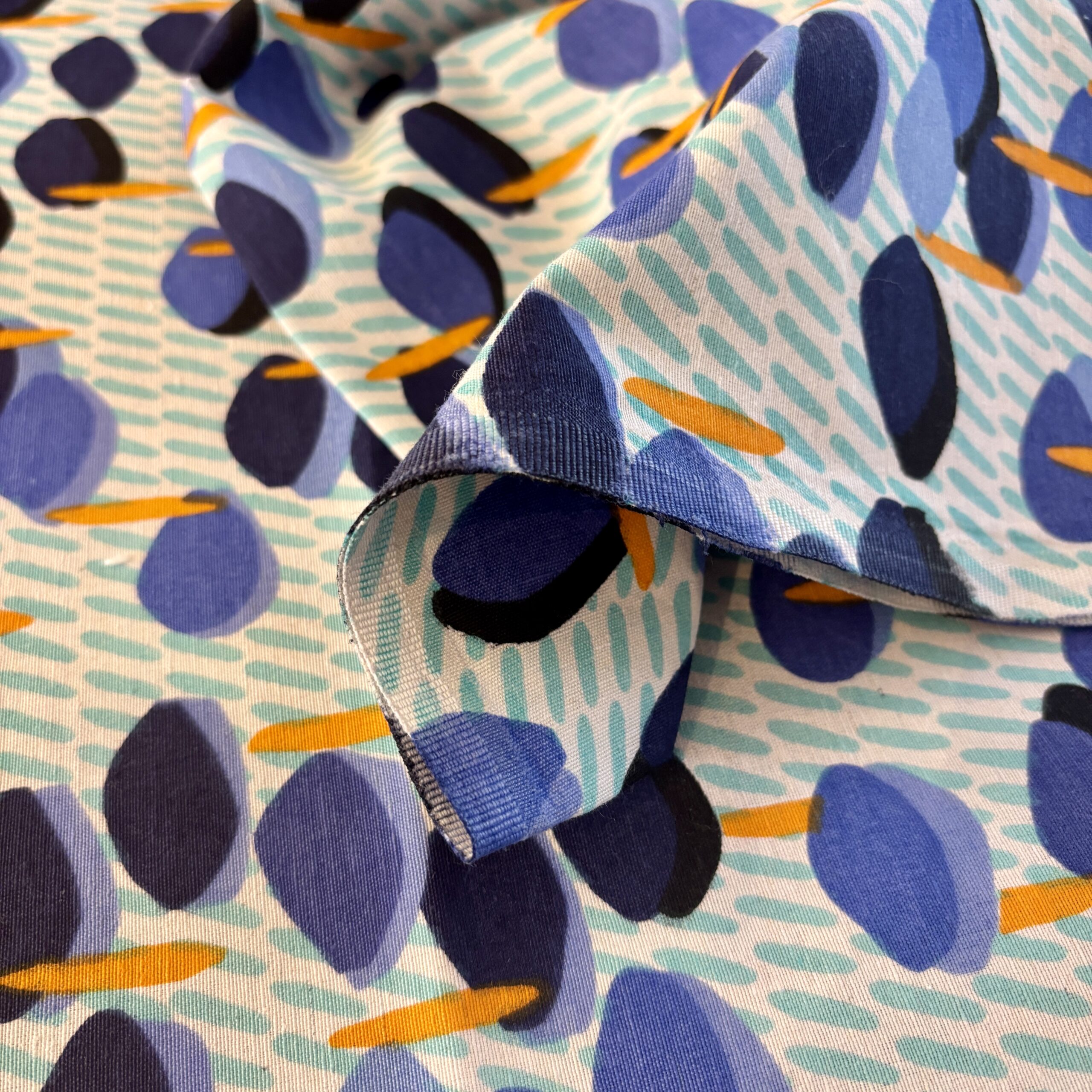 • Couleurs/Motifs : Motifs Pastilles bleues, formes oranges sur fond blanc et turquoise