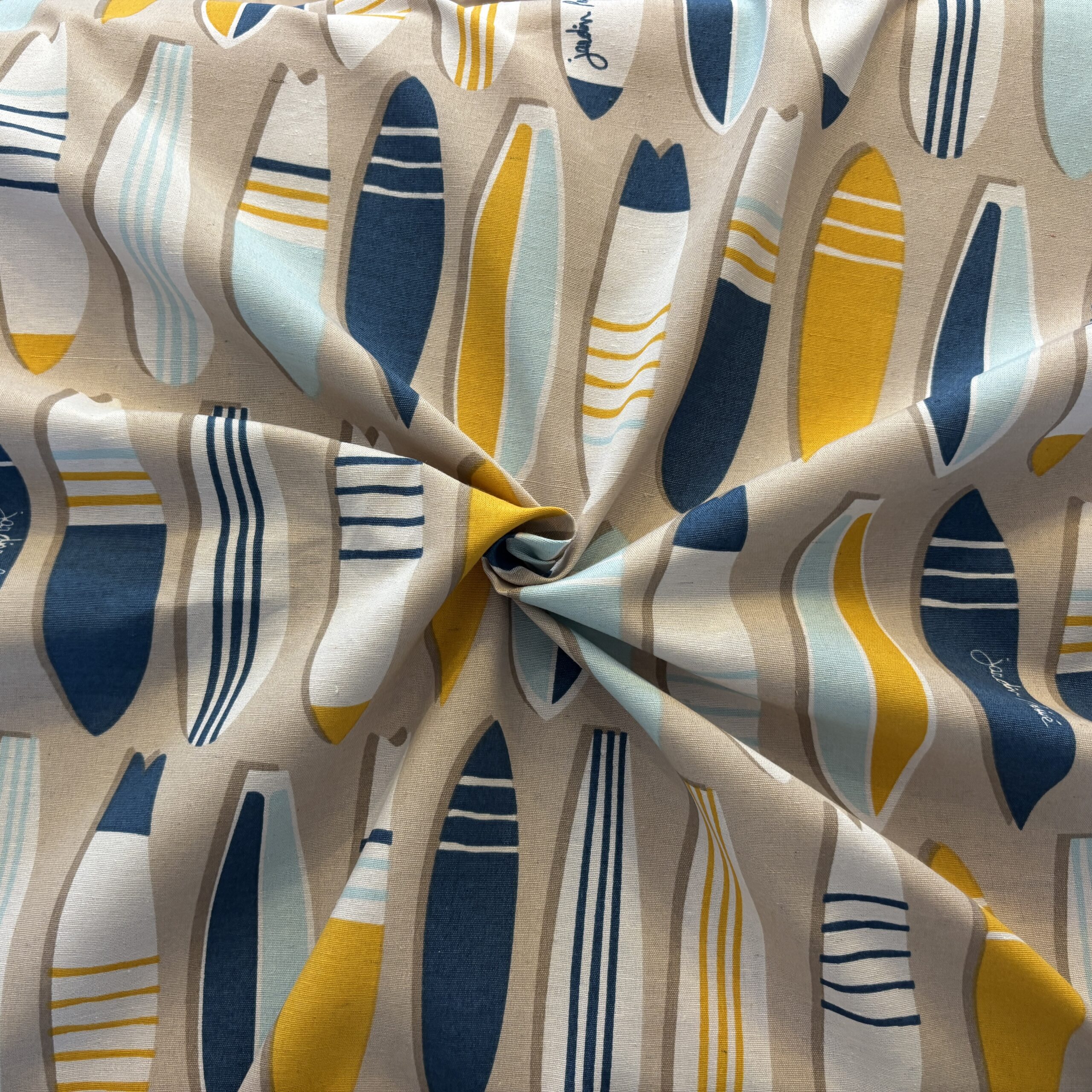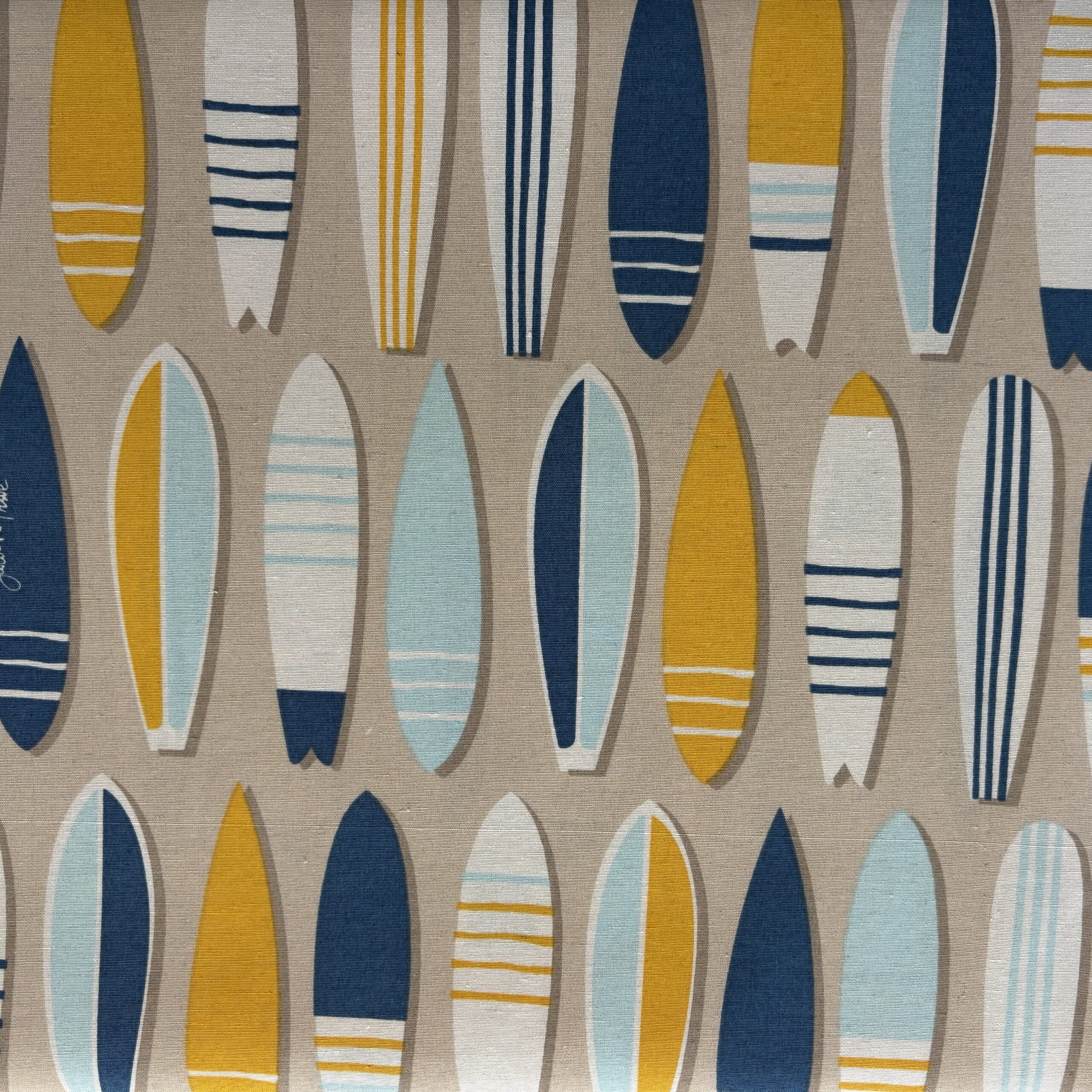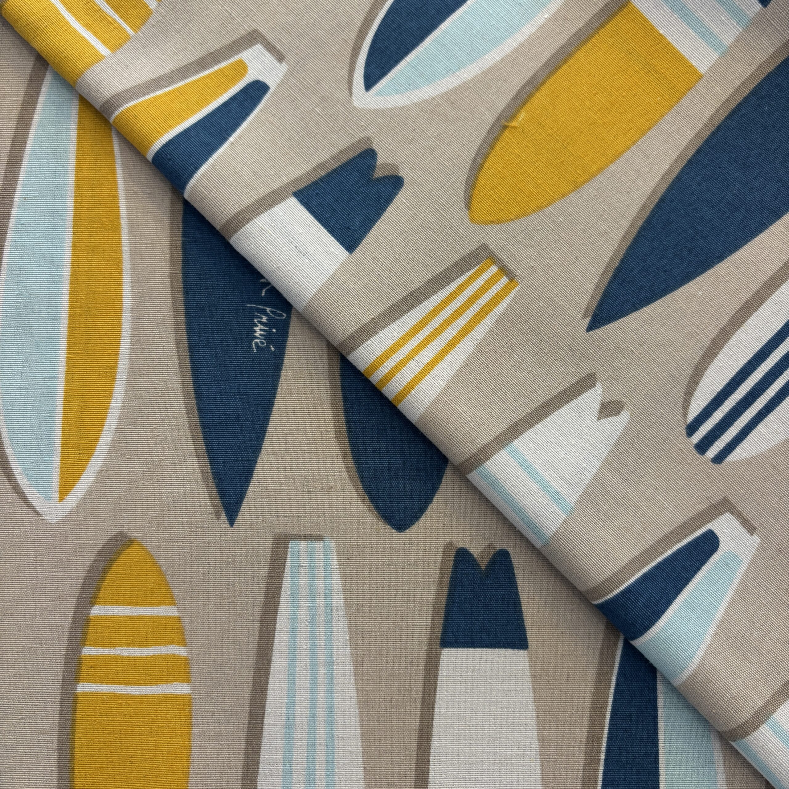 • Couleurs/Motifs : Motifs planches de surf bleu/blanc/jaune sur fond beige